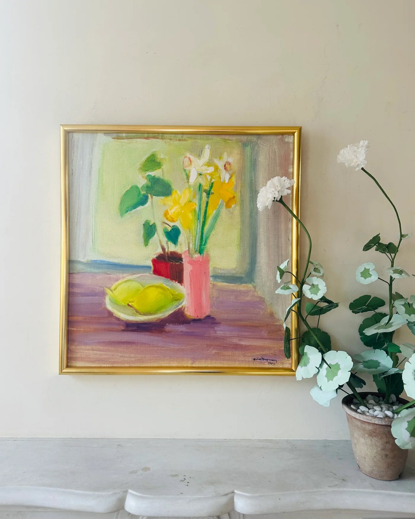 'Daffodils and Pears', signed Gillis Magnusson, dated 1989. Available at Collins & Green Art, please click the image above for more information.
