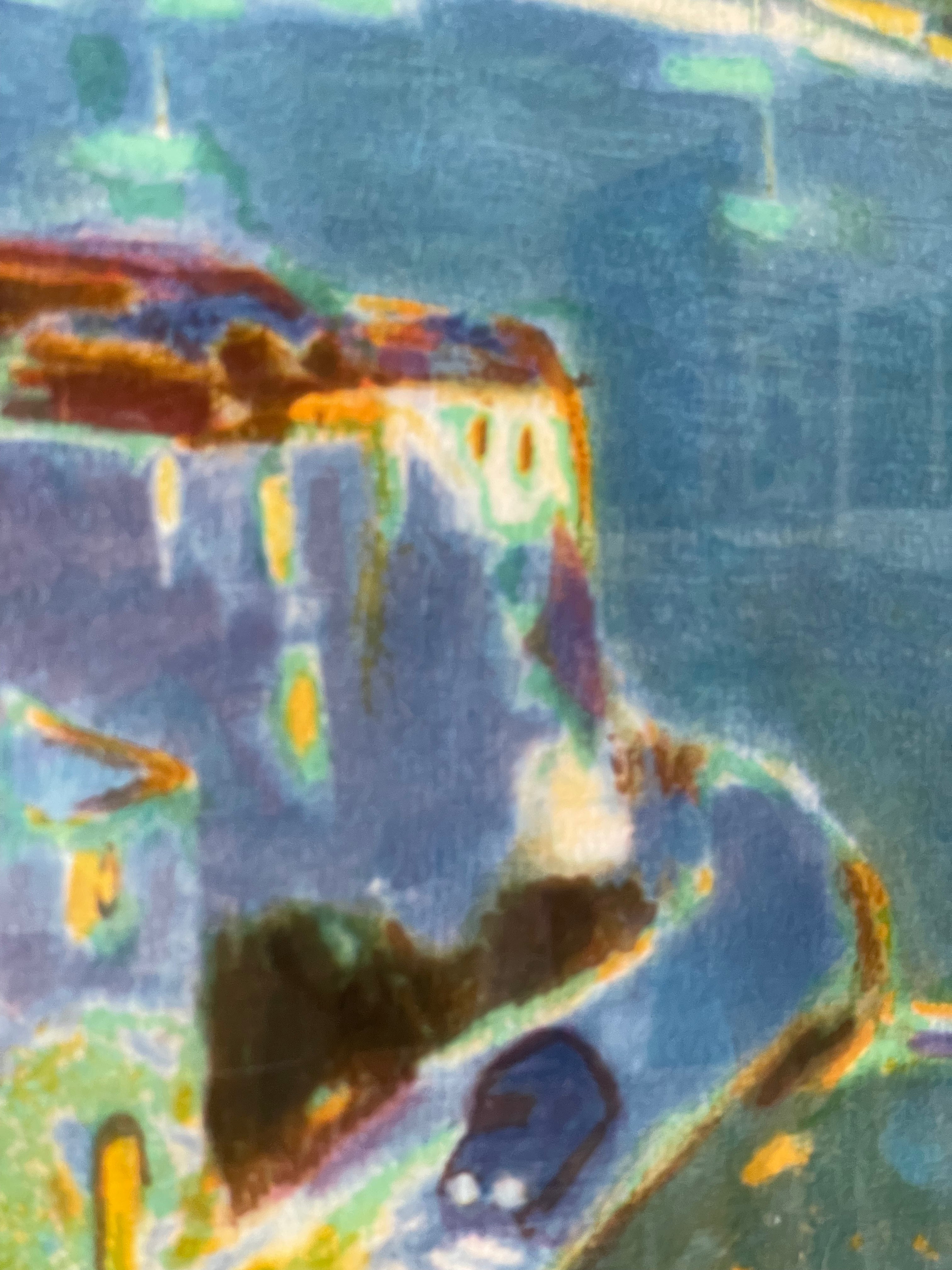 Impressionistic view of Cadaqués, Spain, after sunset. The lights shining through the windows of the white buildings vie with the moonlight on the surface of the sea. A lovely, very painterly lithograph.