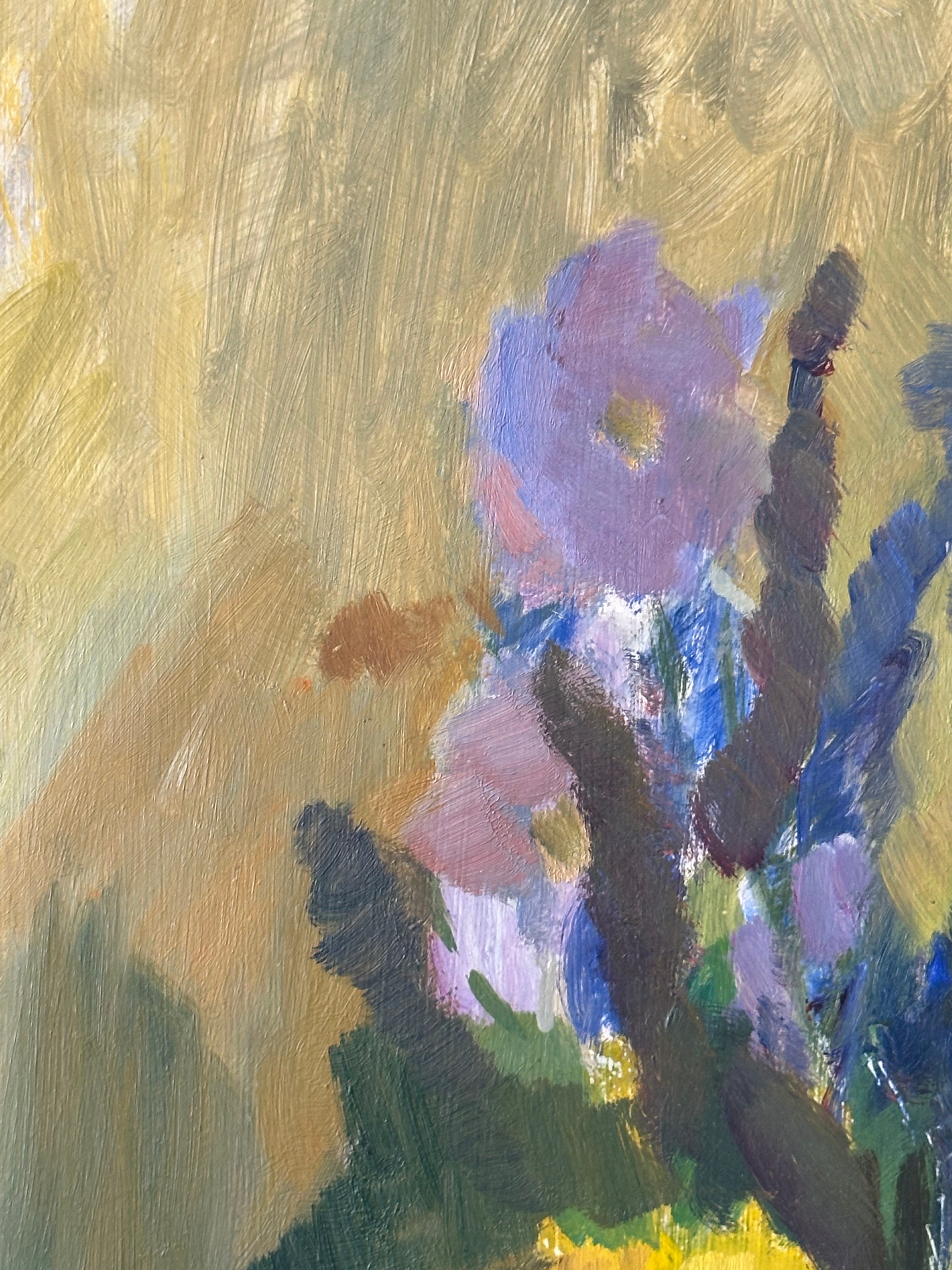Beautiful large Swedish still life painting of a purple and yellow flowers in a translucent green vase.