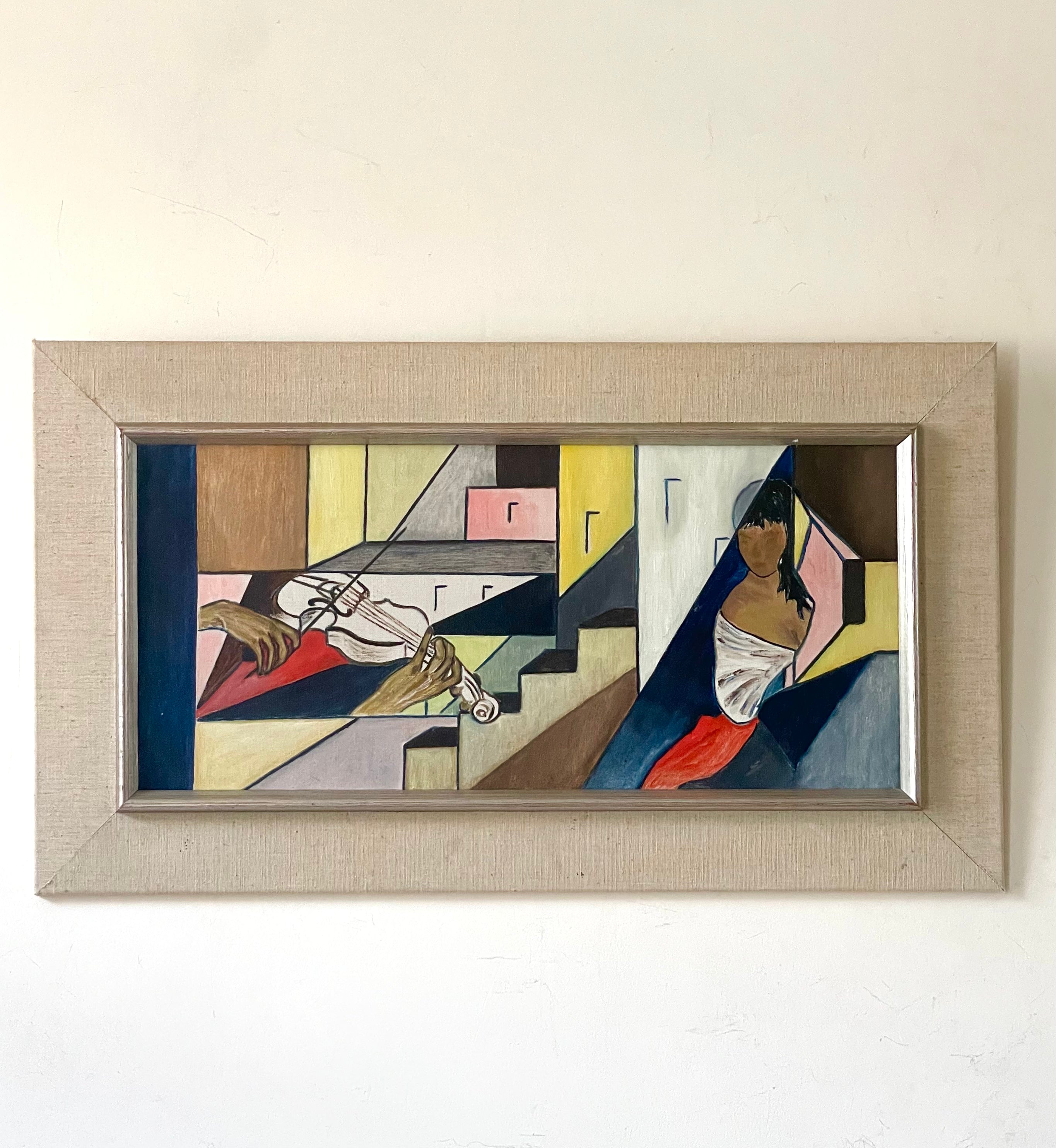 Colourful Cubist-style abstract of a violin being played, on the left, and a woman listening, set within a vibrant geometric cityscape.