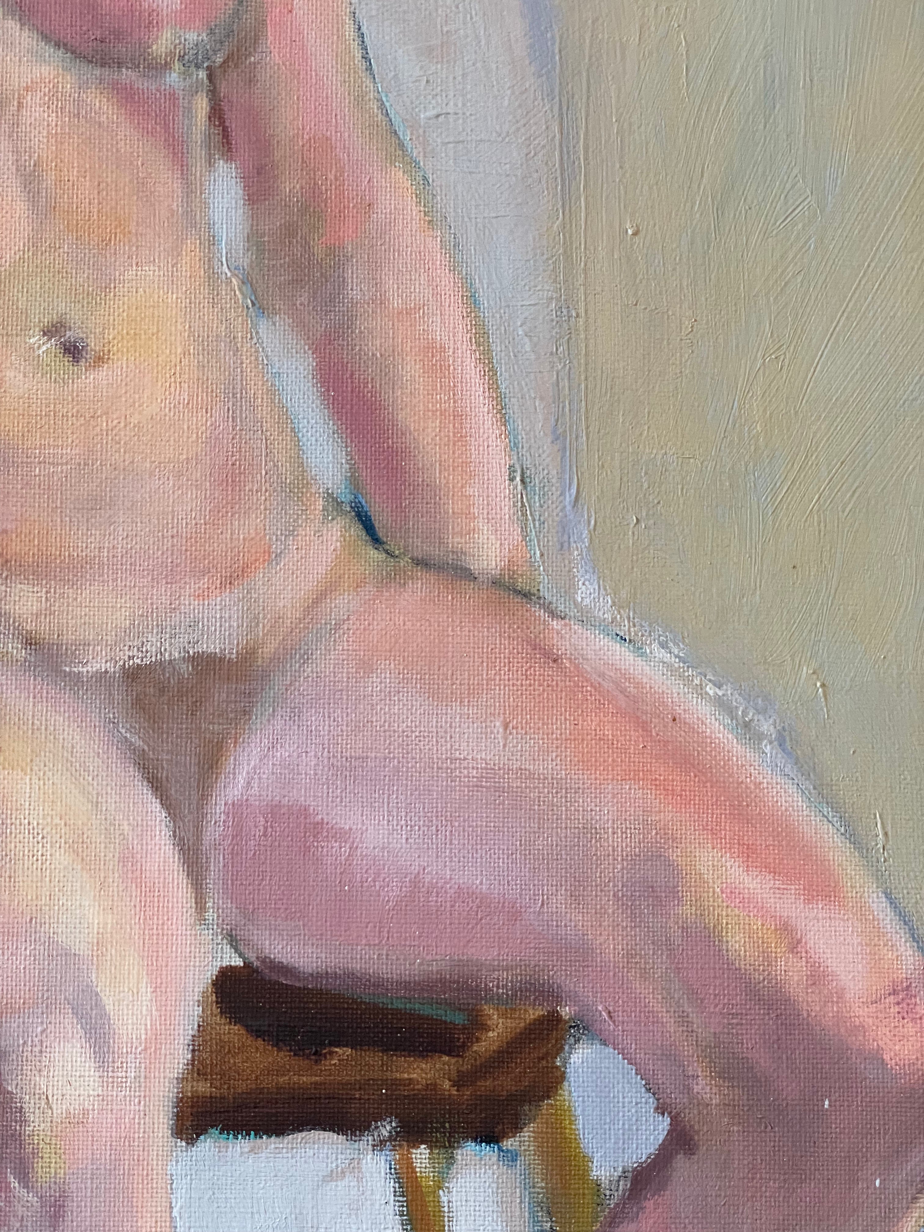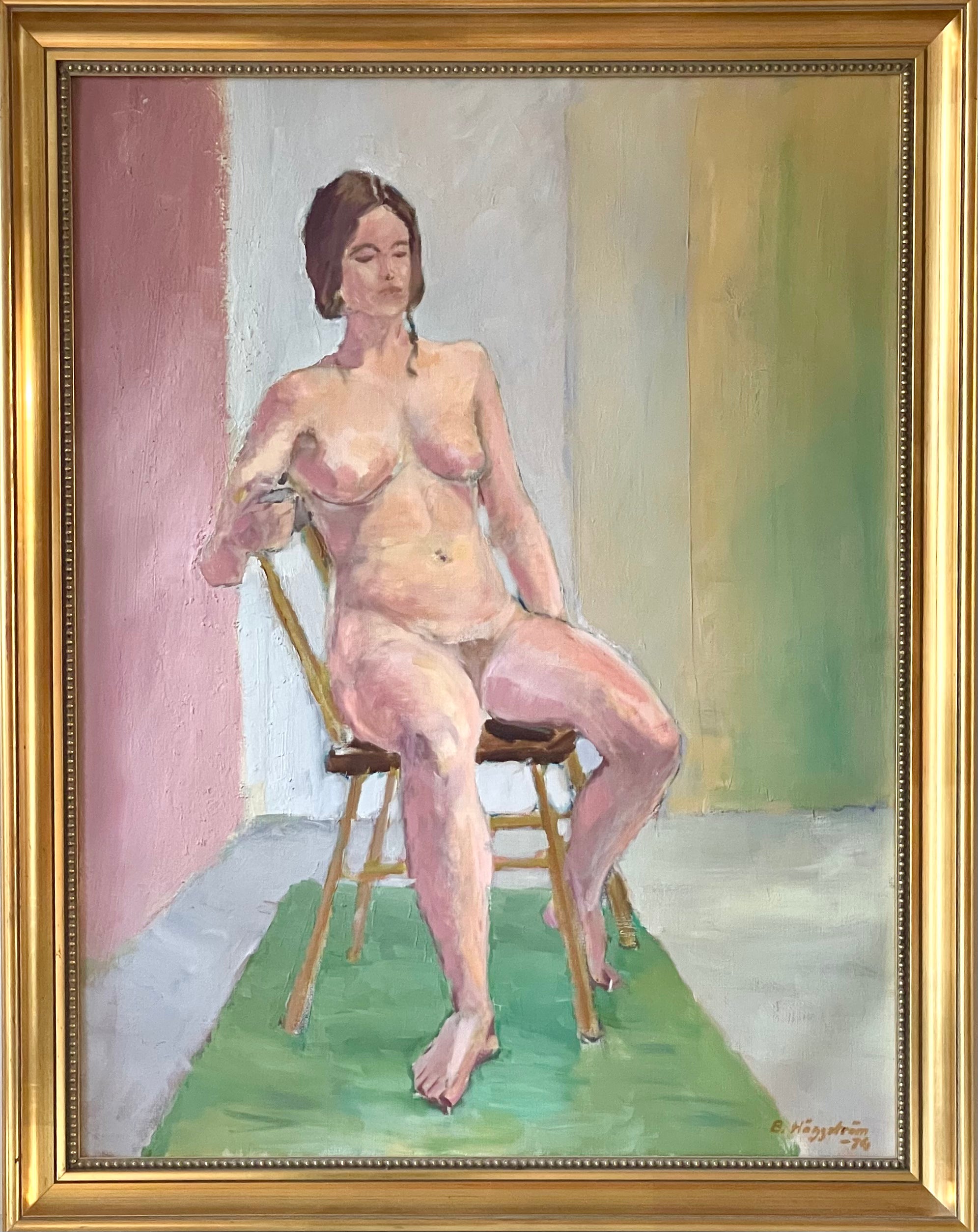 Beautiful large scale Swedish female nude. She looks at the viewer from her chair which is placed on a green rug, in a room with a pink, light blue, and green wall echoing the flesh tones and creates a sense of depth.