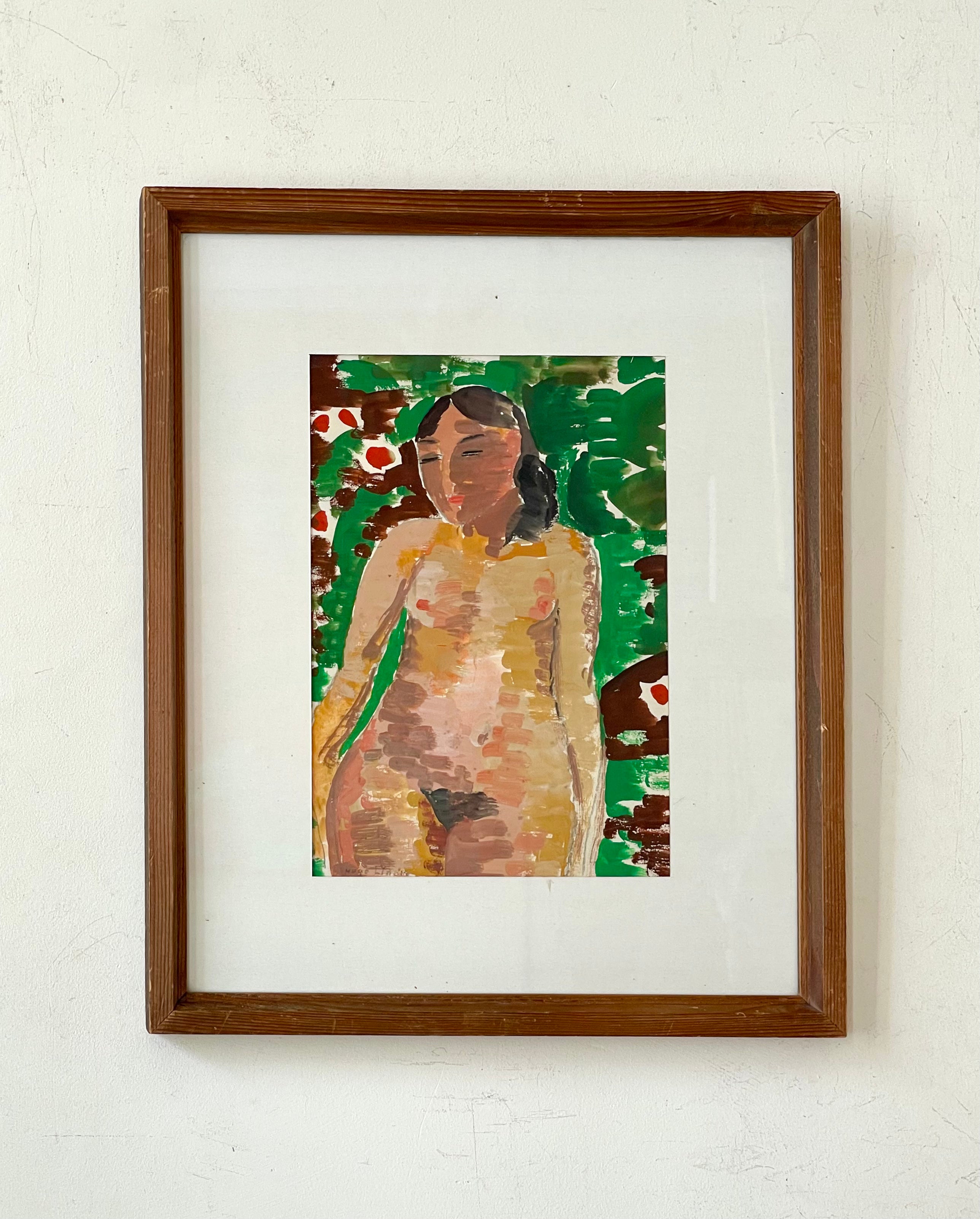 Gouache on paper with a card mount under glass and vintage wooden frame.