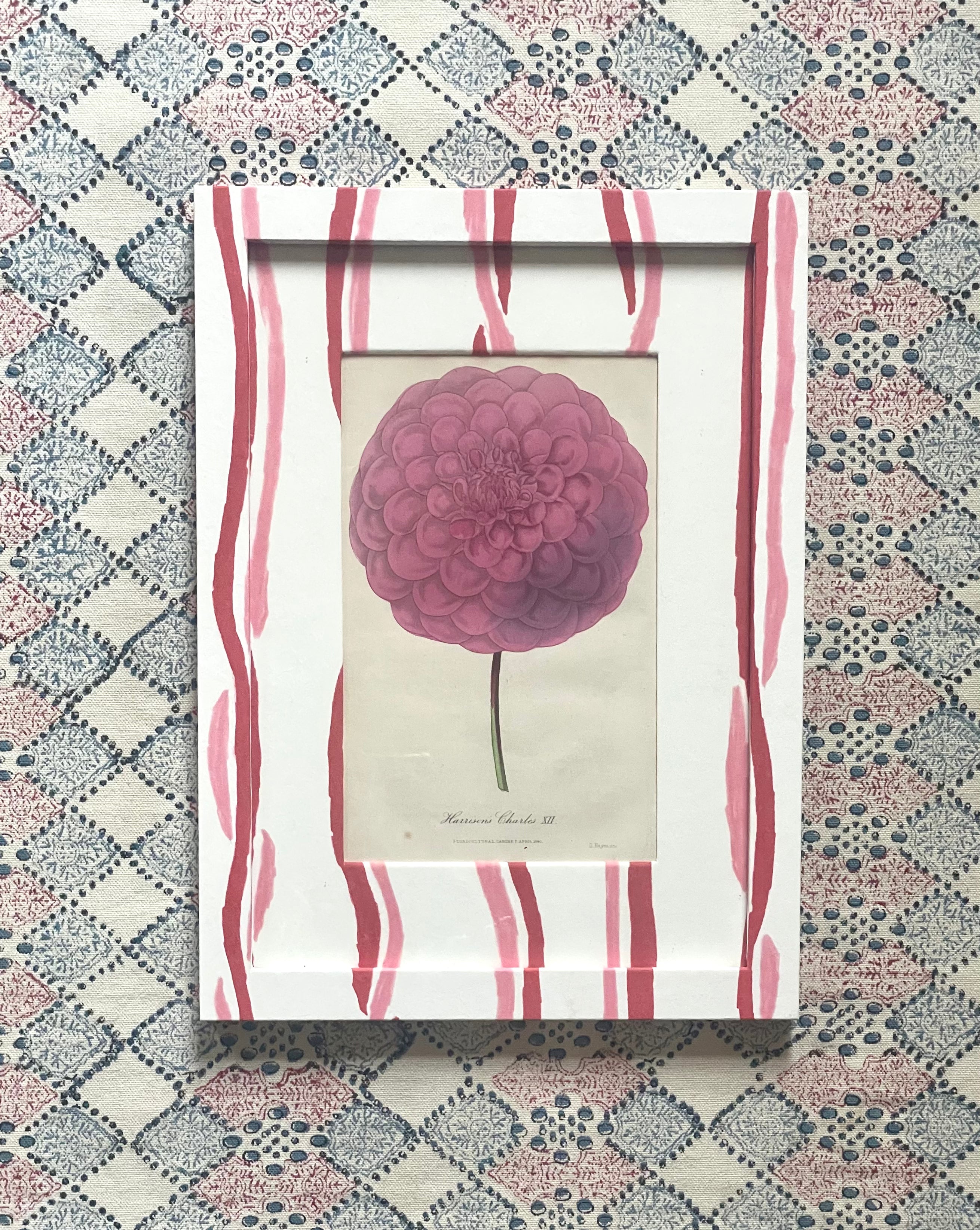 Beautiful hand coloured 19th century floral botanicals of dahlias, hand framed in "Ribbons Wrap You Up" wallpaper by Susi Green and Common Room. These make lovely presents.