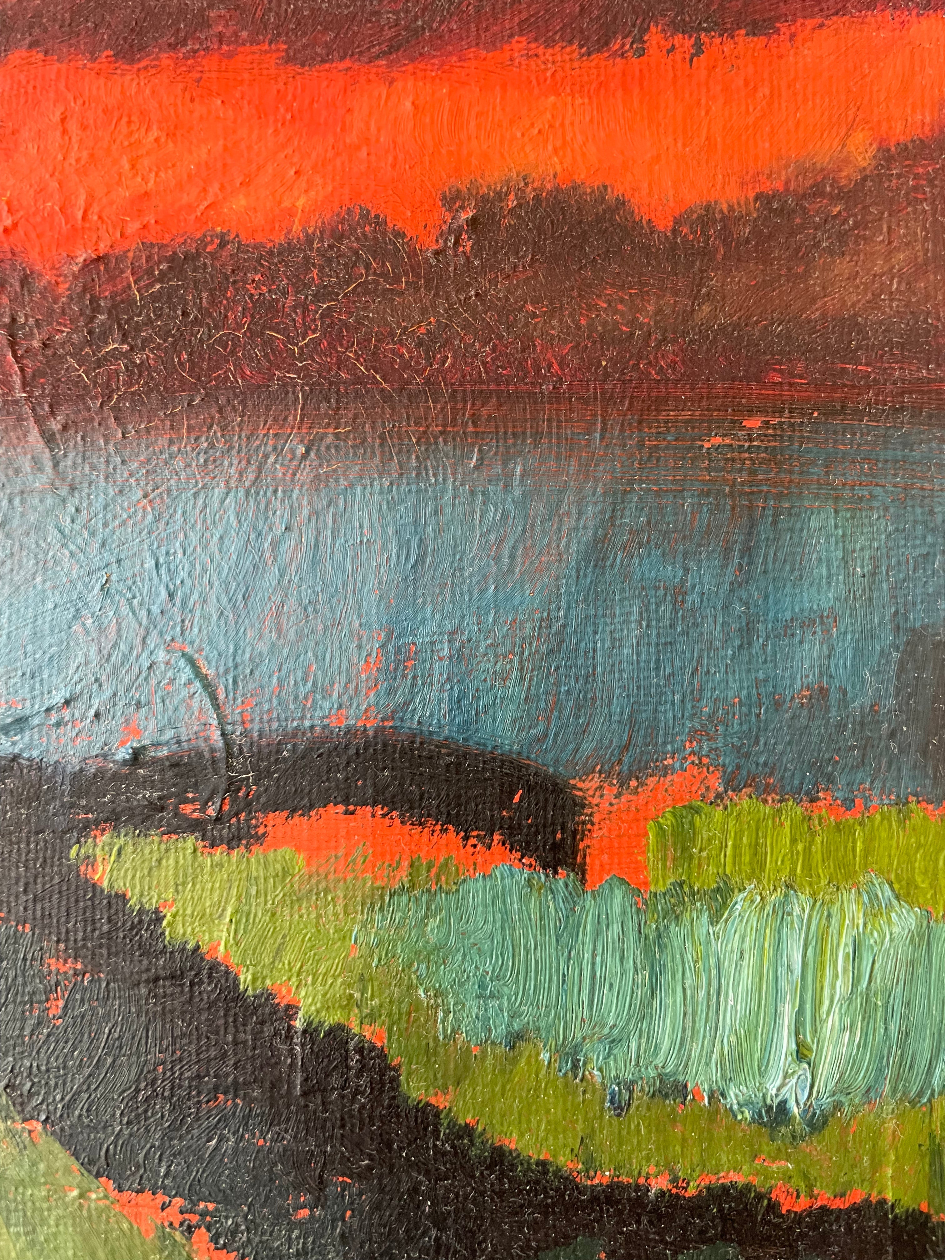 Striking abstracted landscape of a red and black sky over blue water. The dramatic colours make this a really distinctive and modern painting.