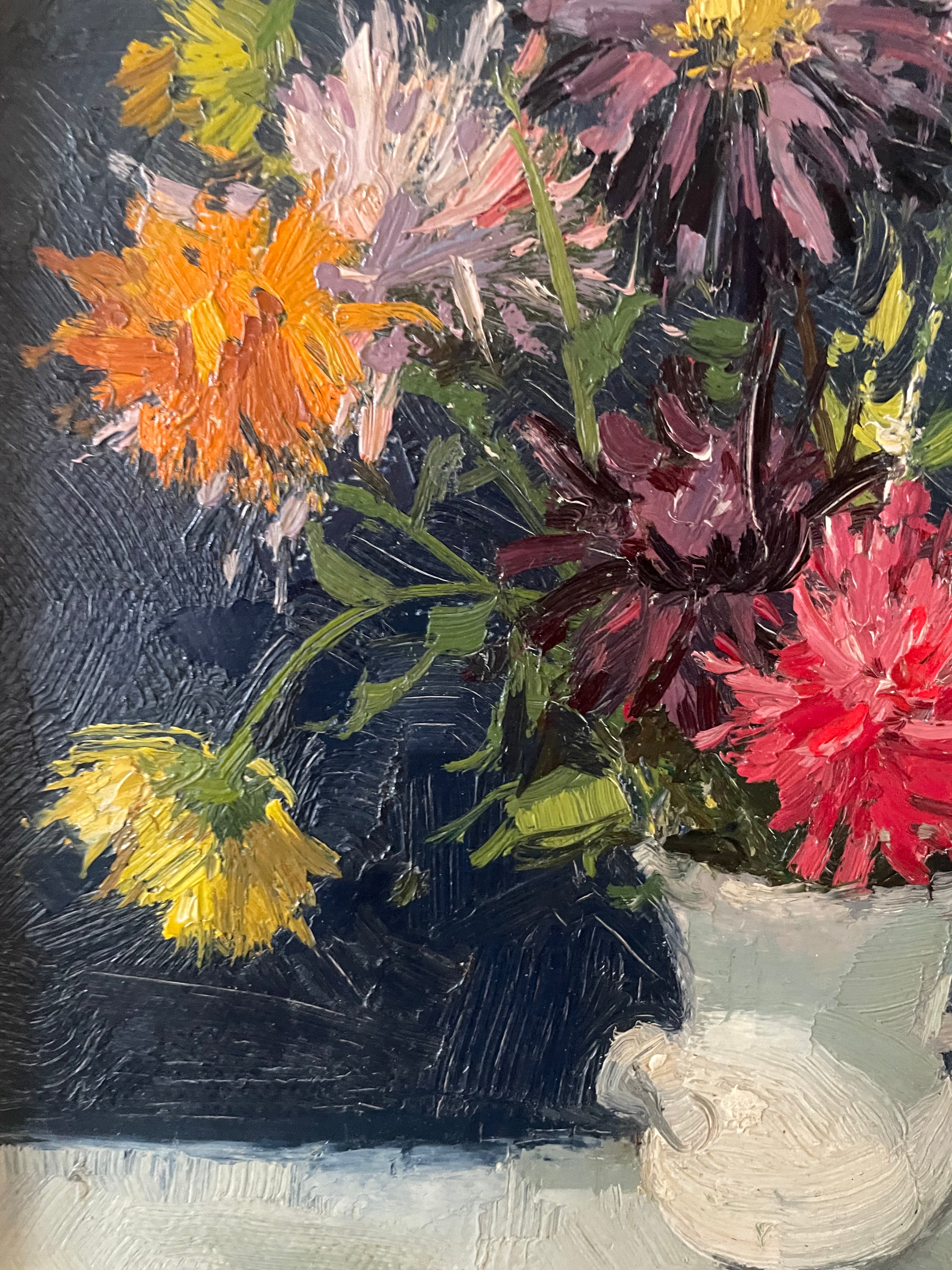 Charming painting of summer flowers in a white ceramic vase with a dark blue background.