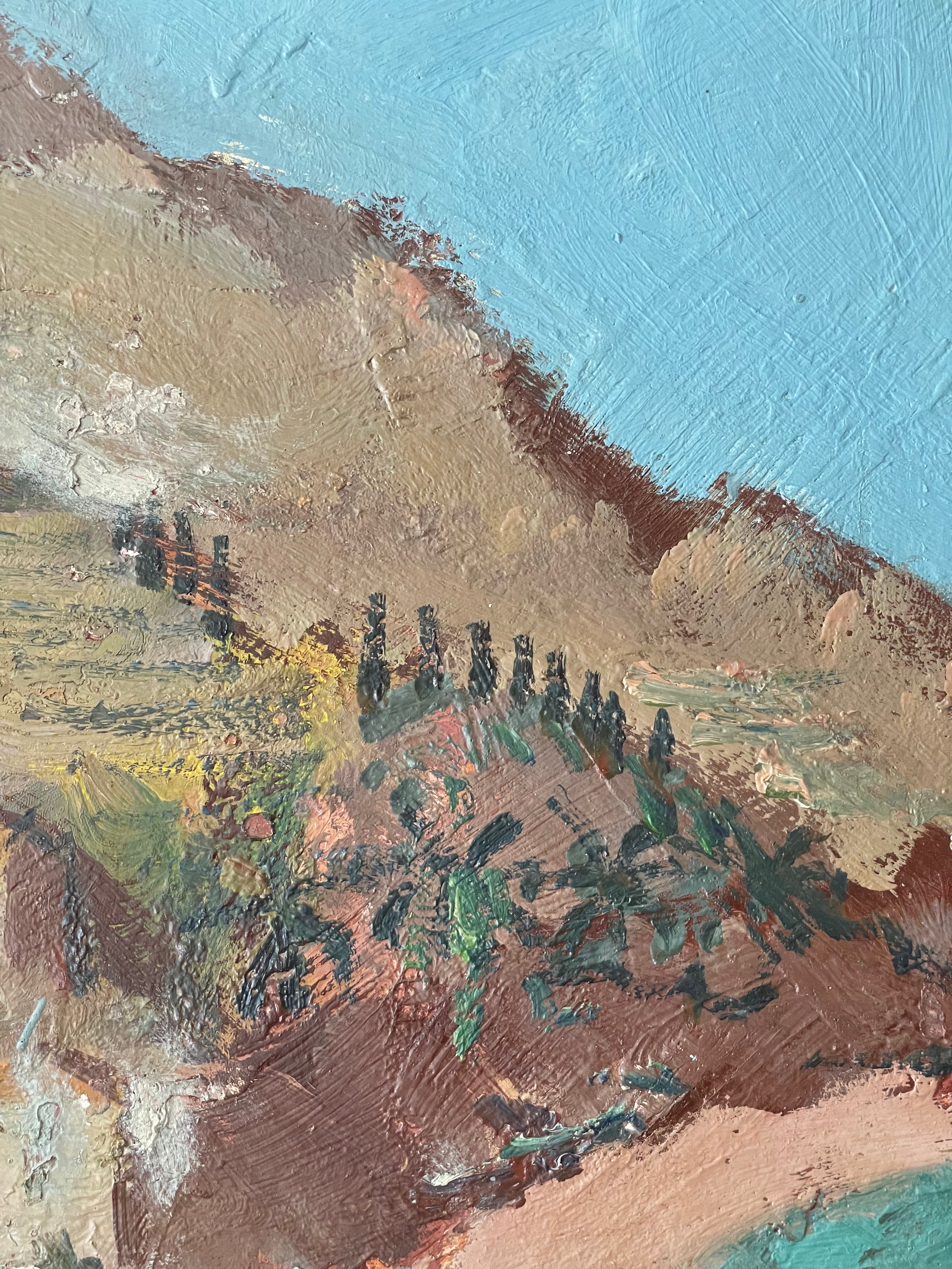 Large painting of a village by the sea with boats drawn up on the sand. The mountains and terraced hills tower in the background under an azur sky. The palette is clear and vibrant and the artist has created a wonderful sense of depth with the terraced hillside in the background and the sandy beach and clear blue sea sweeping through the painting. It's a lovely bright painting reminiscent of hot summer holidays!