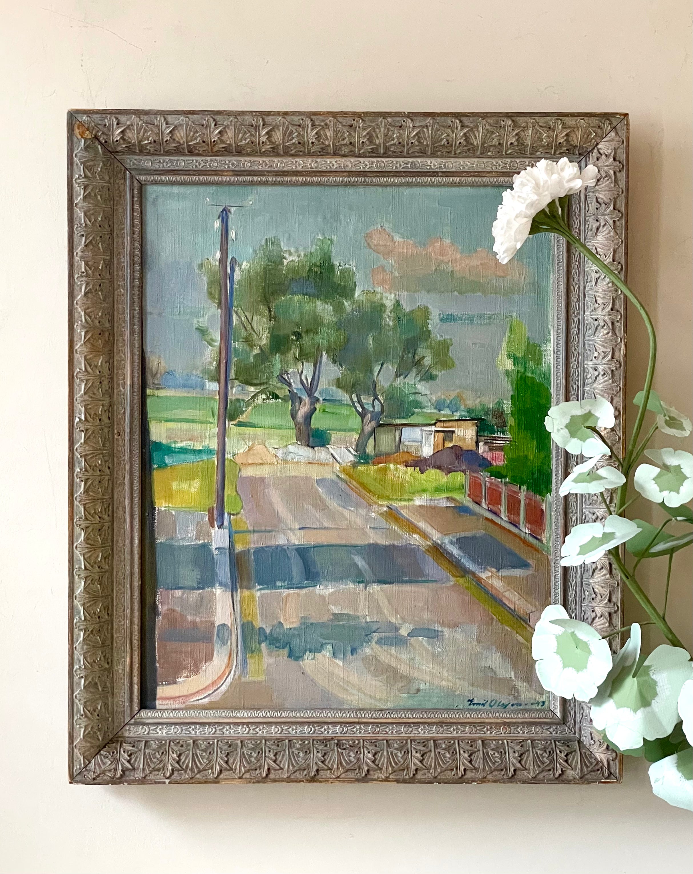 Oil on canvas in an ornate vintage wood frame. Please examine the photos carefully as the frame is a little chipped but this in no way spoils the painting; it's just part of its vintage charm!