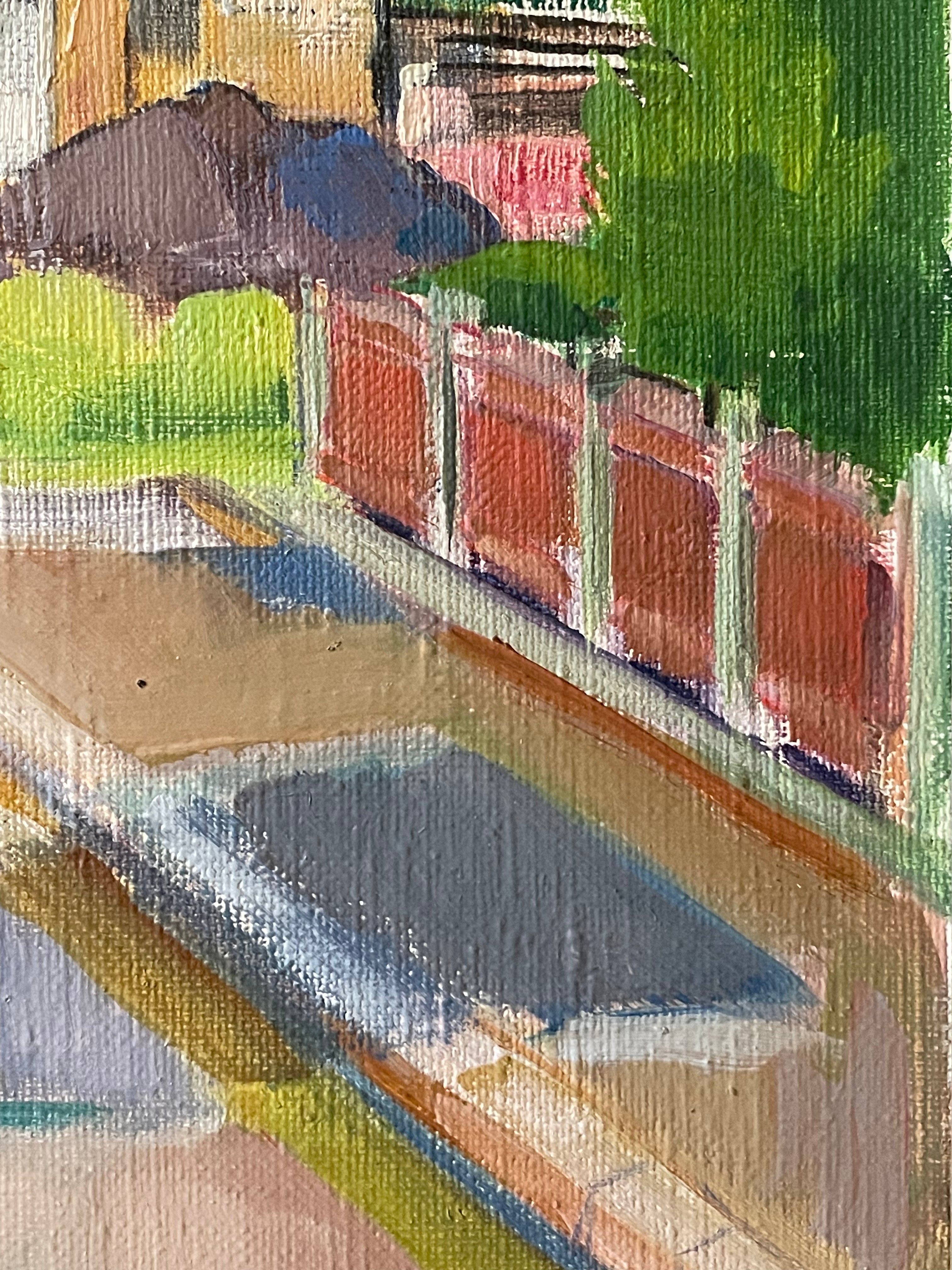 Colourful atmospheric landscape of a wide road with a path on either side. Two trees, and outbuildings can be seen underneath a blue sky with a scudding cloud.
